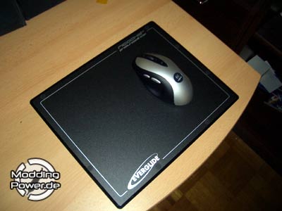 Und wie man sieht, passt das schwarz/silberne Mauspad zum aktuellen Trend der schwarz/silbernen Computerhardware. Außerdem macht es stets einen schönen und modernen Eindruck. Schön zu erkennen ist auch, dass die recht große Logitech Maus recht viel Platz auf dem Mauspad findet. Und dazu kommen wir jetzt auf die nächste Seite: die "technischen Daten"