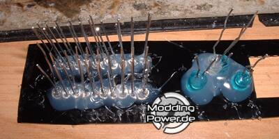 Danach habe ich die LEDs mit Heisskleber hinter den Löchern befestigt. Links die